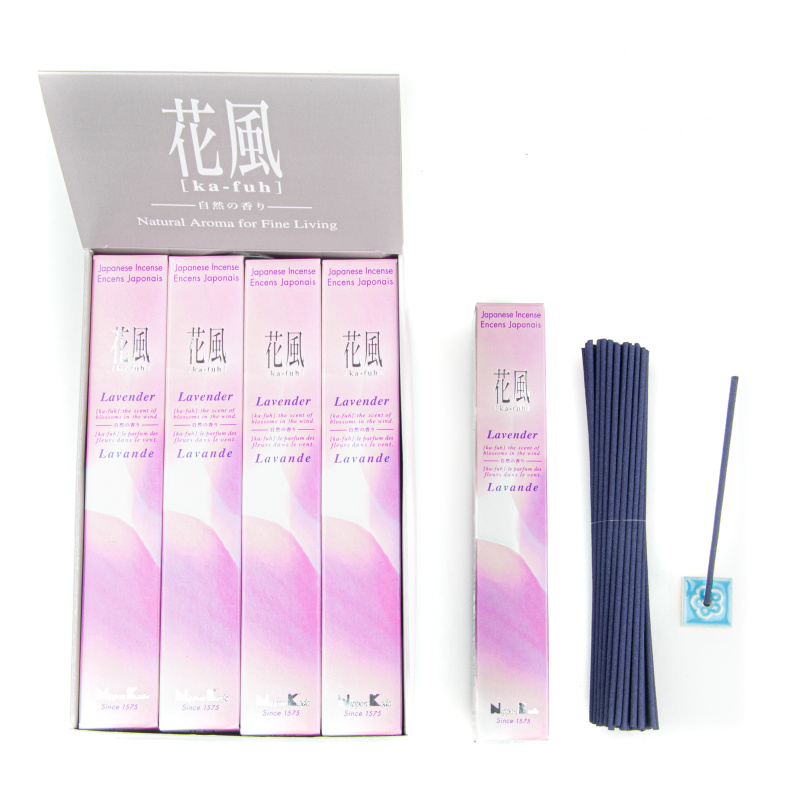 Japonské vonné tyčinky Nippon KAFUH Lavender, to jsou velmi kvalitní tyčinky, vyráběné čistě přírodními postupy, představují elegantní vůni květů levandule - vynikající svojí jemností, čistou, příjemnou vůní. Tyčinky se dají dobře využít v malých prostorách pro svoje neagresivní vonné vlastnosti, při pálení nevzniká téměř žádný dým. Výborně se hodí k nastolení harmonie a klidu.
