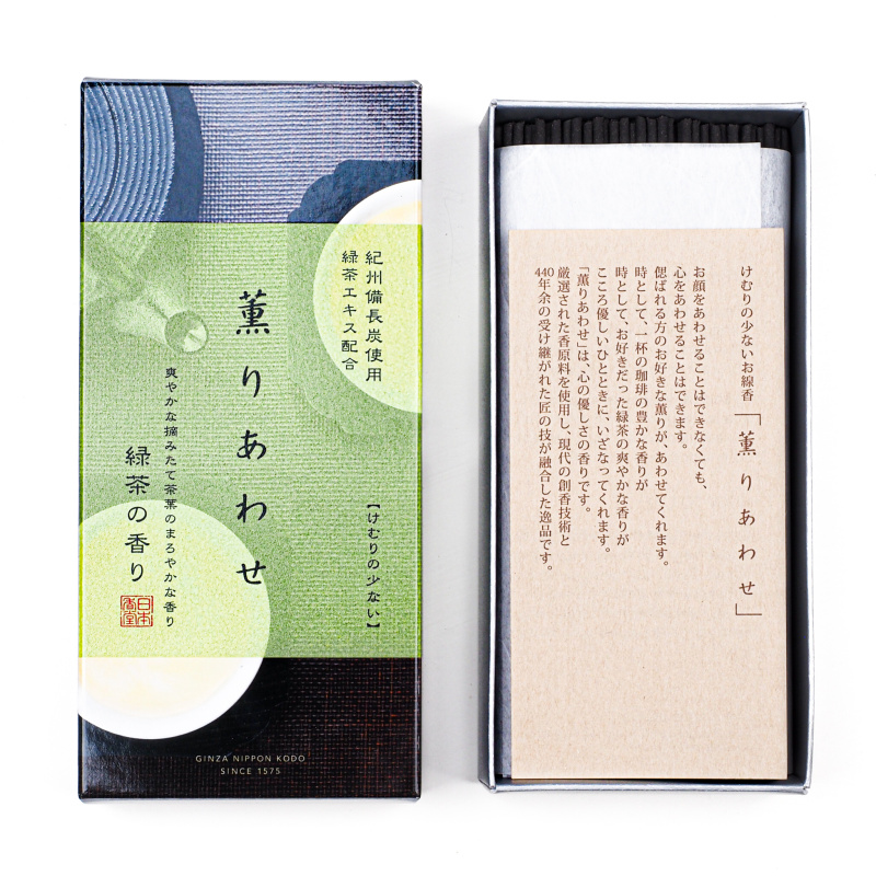 Uvolňující bohaté aroma zeleného čaje, zhmotněné v podobě japonských vonných tyčinek Kaori Awase Green Tea. Tato jemná příjemná vůně vznikla z extraktu a lístků zeleného čaje za pomoci přísad na bázi kinchu bincho, speciálního dřevěného uhlí s velkou schopností vstřebávání a čištění. Svěží uklidňující vůně zeleného čaje v tyčinkách Kaori Awase se dokonale hodí pro chvíle odpočinku a relaxace a navodí pocit klidu a pohody.