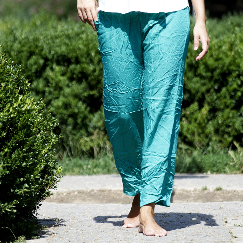 Volné kalhoty Yoga ručně šité s láskou na indonéském ostrově Bali. Kalhoty mají v pase gumu, jejich nošení je tak ještě pohodlnější.