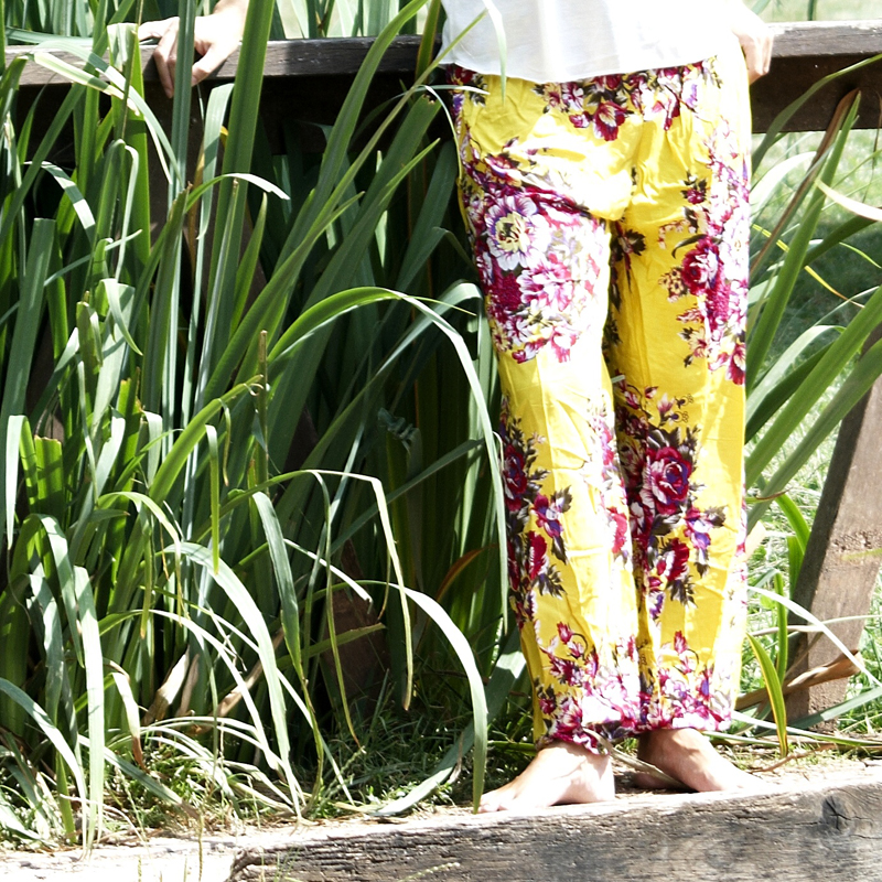 Pohodlné volné kalhoty Yoga Květiny 01 ve žluté barvě