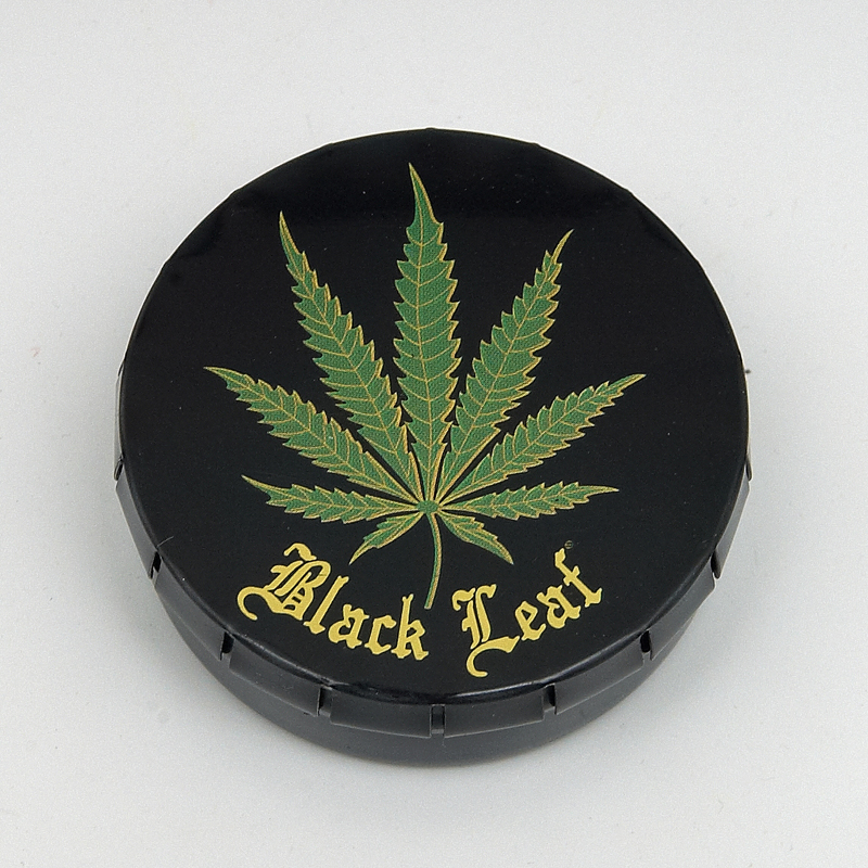 Hliníkový zásobník s uzávěrem klik klak v černé barvě, motiv Black Leaf, typ headcase Black Leaf černý