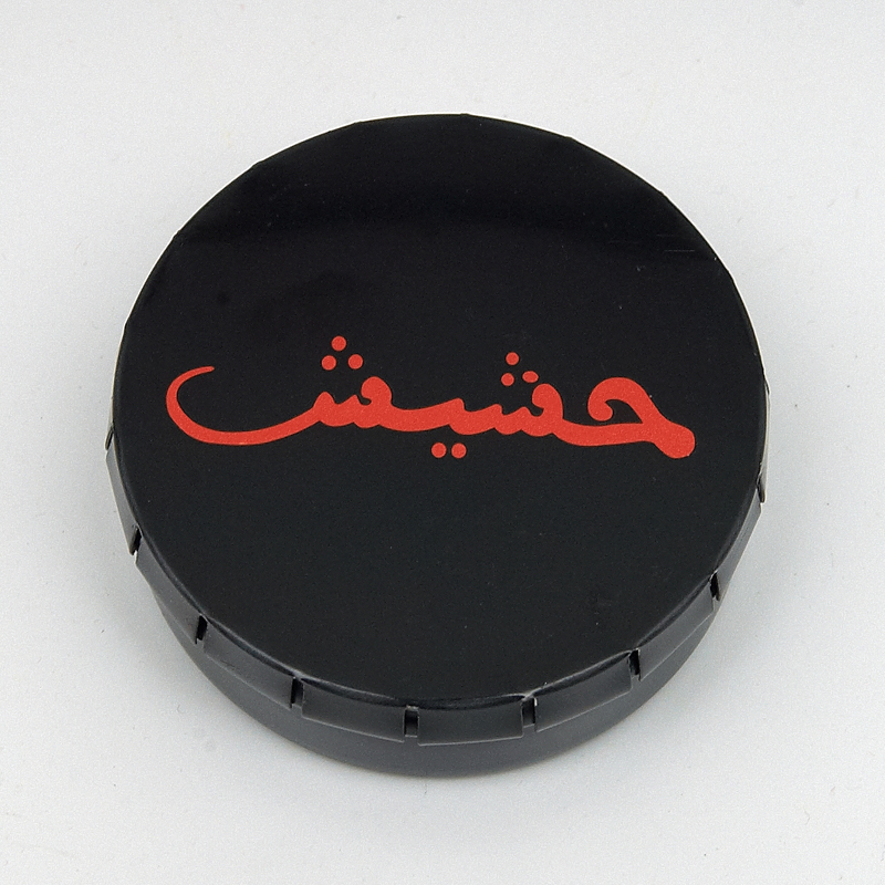 Hliníkový zásobník s uzávěrem klik klak v černé barvě, s nápisem Hashish, typ headcase Hashish arabia