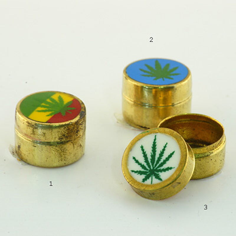Malá kulatá krabička vyrobená z kovu. Na víčku ozdobená malým konopným lístkem. V naší nabídce je několik barevných variant těchto krabiček.