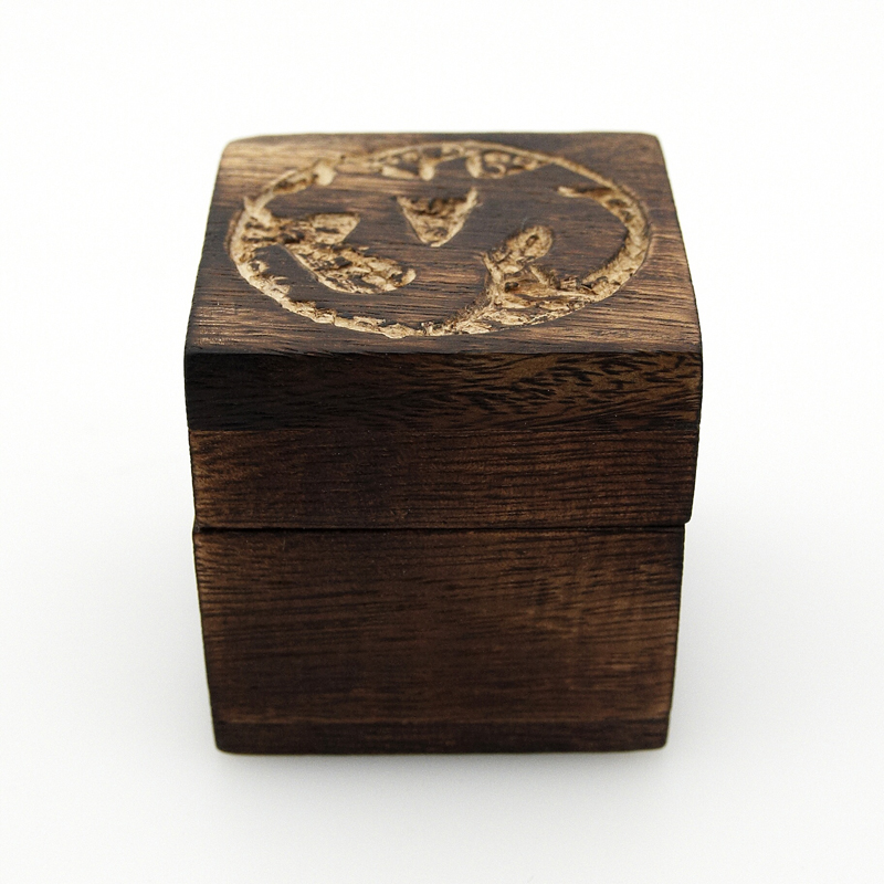 Malá krabička vyrobená ze dřeva ozdobená symbolem Om na horní straně krabičky.