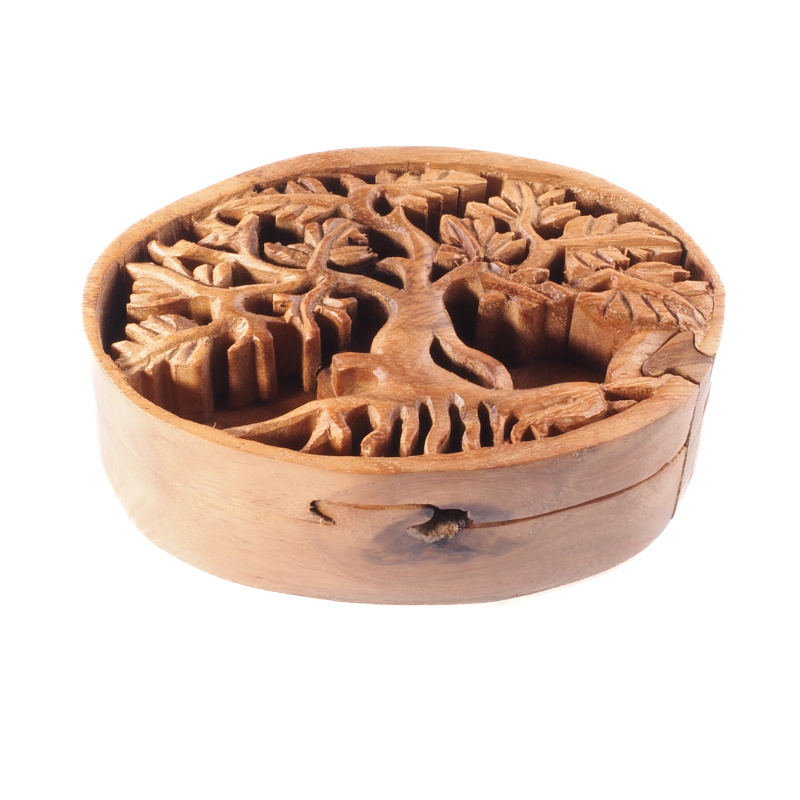 Výjimečná dřevěná truhlička oválného tvaru ozdobená vyřezávaným motivem Stromu života a důmyslným uzavíráním bezpečně uschová všechny vaše šperky, drahocennosti a tajemství.