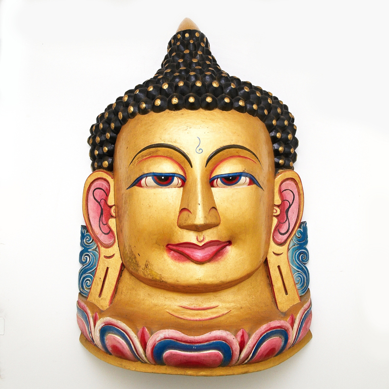 Výrazně zbarvená maska zakladatele buddhismu, jenž na své pouti k osvobození od utrpení neustálého znovuzrozování našel střední cestu a dosáhl stavu osvícení. Tradiční symbol štěstí a blahobytu.
