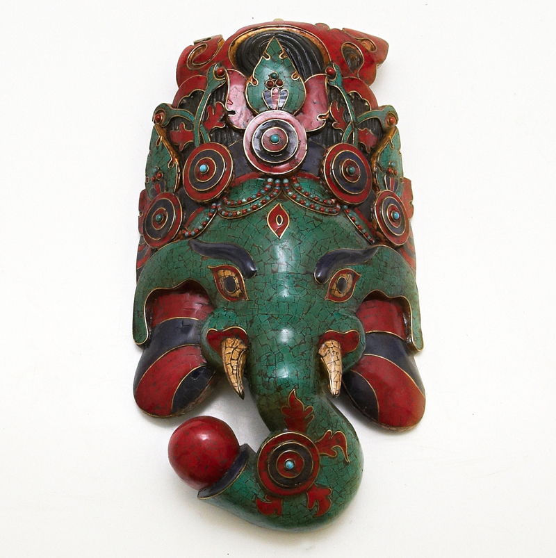 Mozaikově zbarvená maska značně uctívaného boha hinduistického pantheonu, Ganeshy. Pán úspěchu, vědomostí, vzdělání, ničitel zla a překážek.