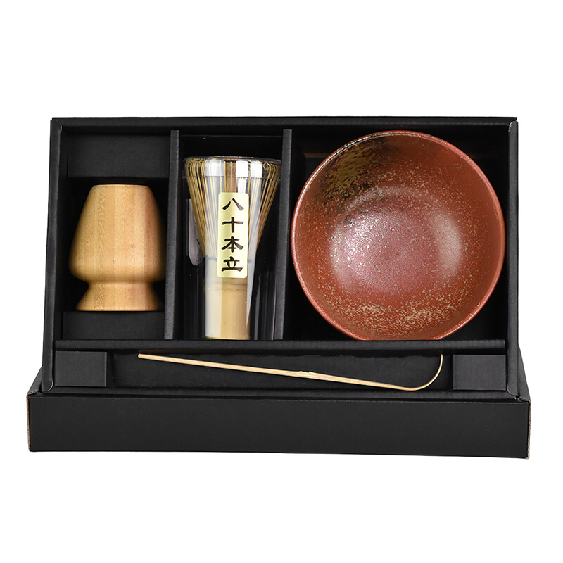 Tento set obsahuje kameninovou misku, bambusovou lžičku na matchu Chashaku, bambusovou metličku Chasen a keramický držák na Chasen.
