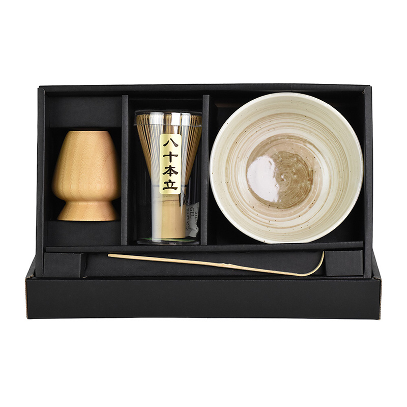 Tento set obsahuje kameninovou misku, bambusovou lžičku na matchu Chashaku, bambusovou metličku Chasen a keramický držák na Chasen.