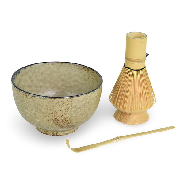 Tento set obsahuje kameninovou misku, bambusovou lžičku na matchu Chashaku, bambusovou metličku Chasen a keramický držák na Chasen.