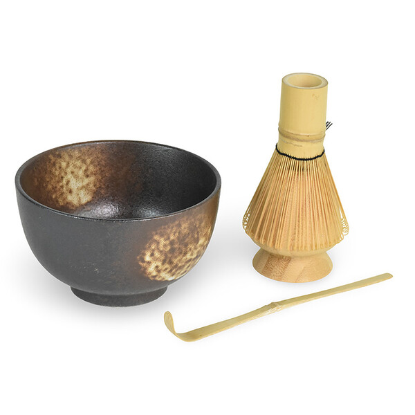 Tento set obsahuje kameninovou misku, bambusovou lžičku na matchu Chashaku, bambusovou metličku Chasen a keramický držák na Chasen.