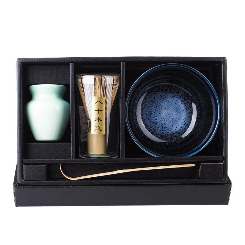Tento set obsahuje kameninovou misku, bambusovou lžičku na matchu Chashaku, bambusovou metličku Chasen a keramický držák na Chasen.
