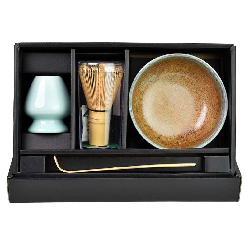 Tento set obsahuje kameninovou misku, bambusovou lžičku na matchu Chashaku, bambusovou metličku Chasen a keramický držák na Chasen.