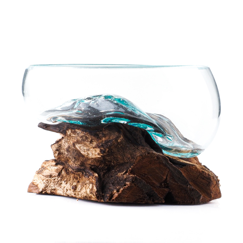 Neobyčejné spojení přírody a lidské tvořivosti v podobě skleněné misky zasazené do neopracovaného kusu dřeva pochází z exotického ostrova Bali, kde je ručně vyráběna místními řemeslníky.