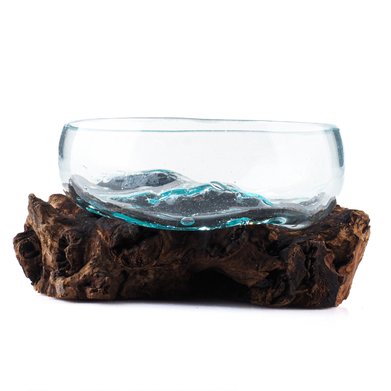 Neobyčejné spojení přírody a lidské tvořivosti v podobě skleněné misky zasazené do neopracovaného kusu dřeva pochází z exotického ostrova Bali, kde je ručně vyráběna místními řemeslníky.