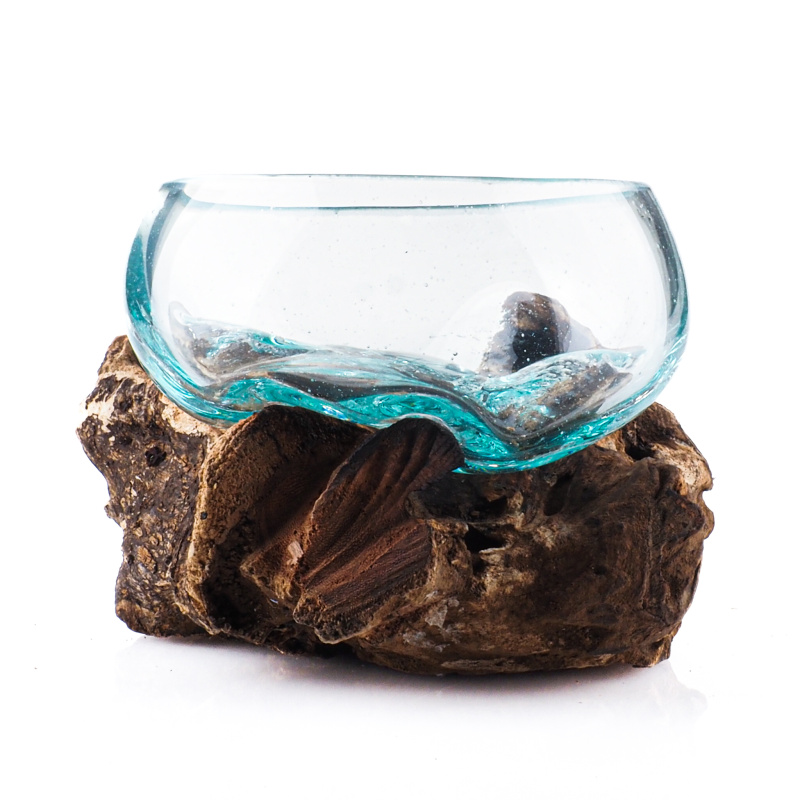Neobyčejné spojení přírody a lidské tvořivosti v podobě skleněné misky zasazené do neopracovaného kusu dřeva pochází z exotického ostrova Bali, kde je ručně vyráběna místními řemeslníky.