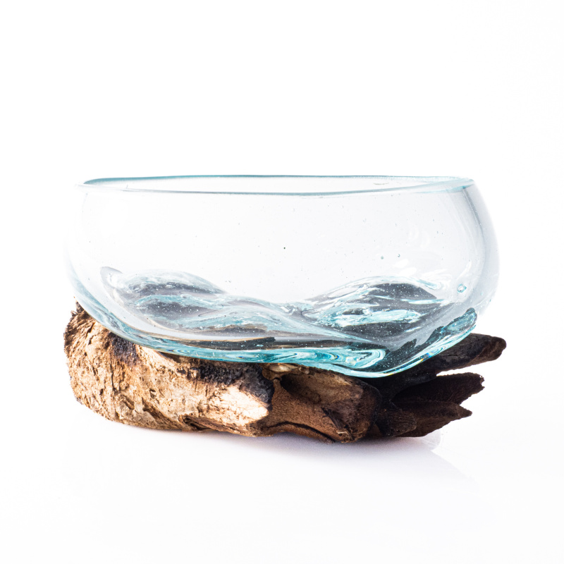 Neobyčejné spojení přírody a lidské tvořivosti v podobě skleněné misky zasazené do neopracovaného kusu dřeva pochází z exotického ostrova Bali, kde je ručně vyráběna místními řemeslníky.