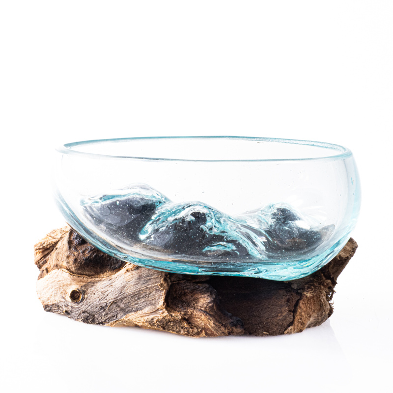 Neobyčejné spojení přírody a lidské tvořivosti v podobě skleněné misky zasazené do neopracovaného kusu dřeva pochází z exotického ostrova Bali, kde je ručně vyráběna místními řemeslníky.
