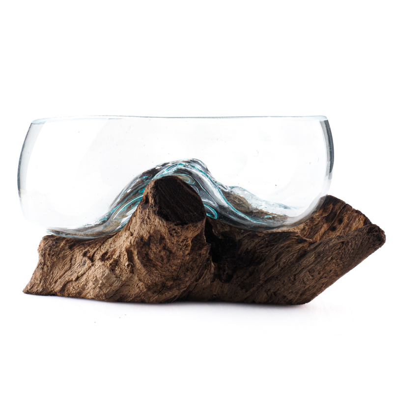Neobyčejné spojení přírody a lidské tvořivosti v podobě skleněné mísy zasazené do neopracovaného kusu dřeva pochází z exotického ostrova Bali, kde je ručně vyráběna místními řemeslníky.