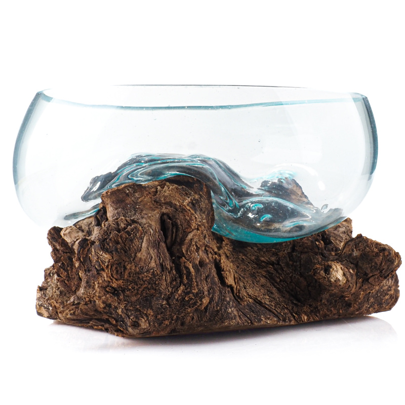 Neobyčejné spojení přírody a lidské tvořivosti v podobě skleněné mísy zasazené do neopracovaného kusu dřeva pochází z exotického ostrova Bali, kde je ručně vyráběna místními řemeslníky.