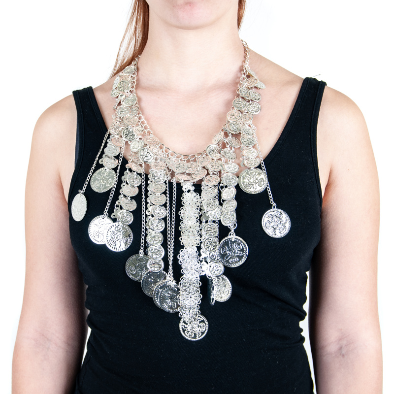 Nádherný náhrdelník na břišní tanec Makara, zdobený stylizovanými kvítky a penízky, barva stříbrná