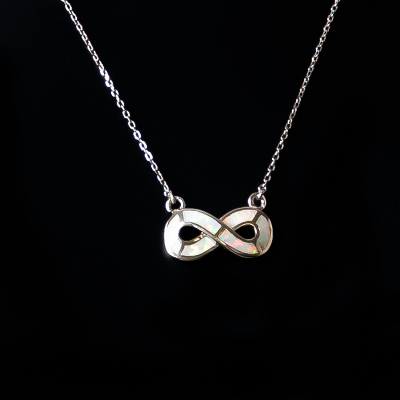 Jemný stříbrný řetízek s přívěskem ve tvaru ležaté osmičky, znaku nekonečna, zdobeným bílými syntetickými opály.