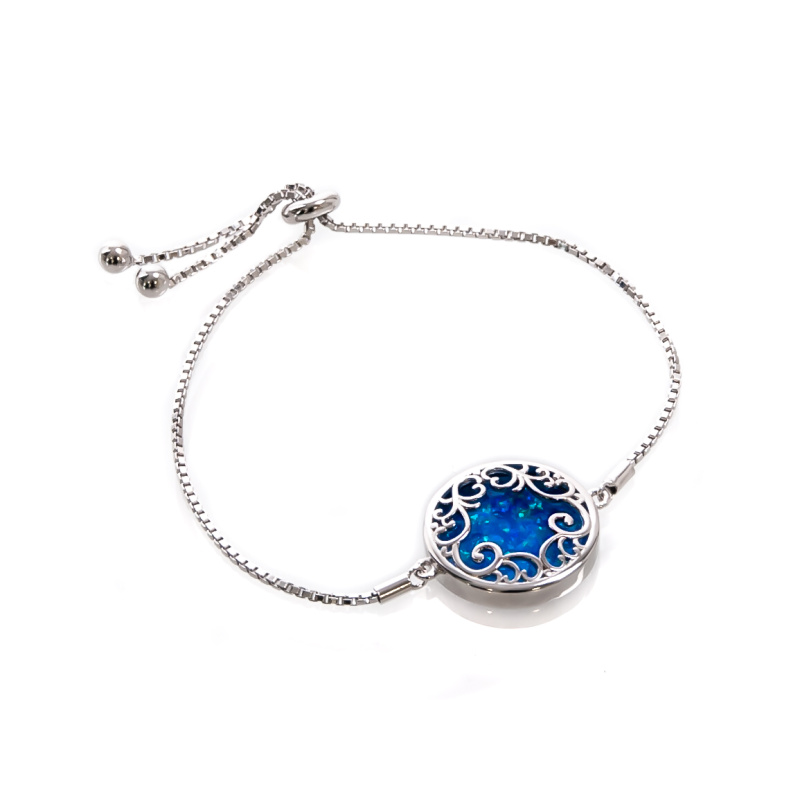 Elegantní stříbrný náramek s okouzlujícím medailonem, zdobeným modrým syntetickým opálem. Medailonek je oboustranný.
