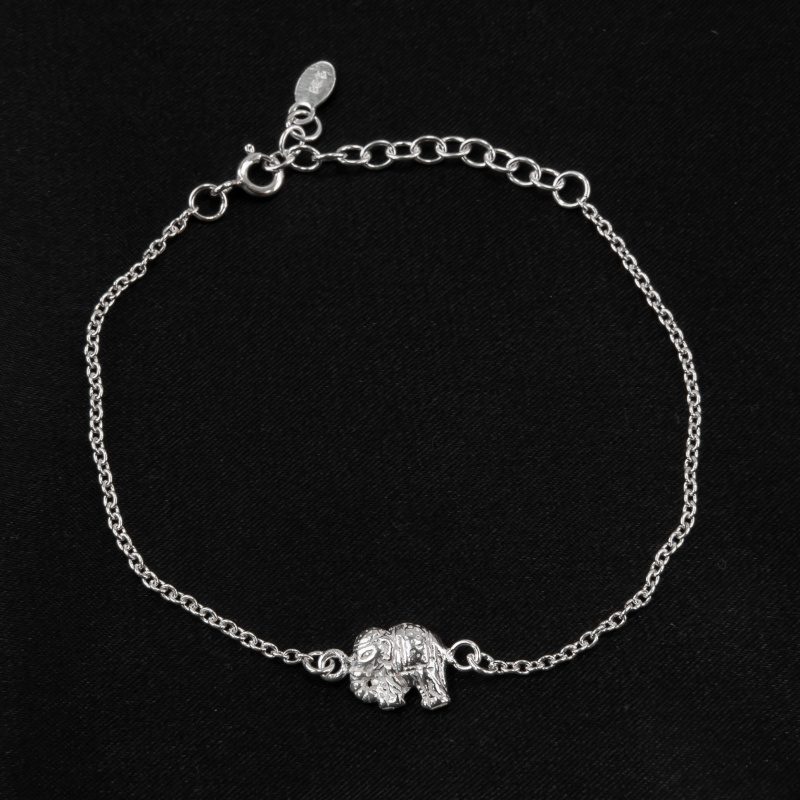 Jemný stříbrný náramek, ozdobený sloníkem.