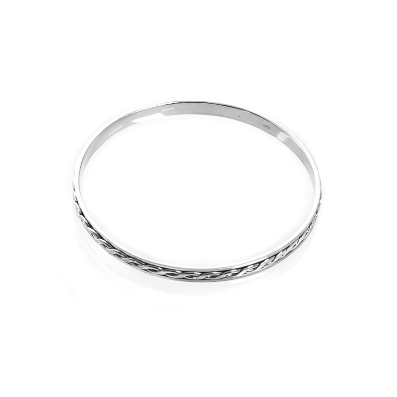 Elegantní kruhový stříbrný náramek, ozdobený spleteným copem po svém obvodu.