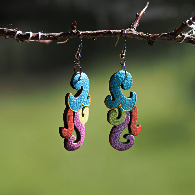 Dřevěné náušnice důmyslného tvaru zdobené pestrými barvami zdůrazní vaši jedinečnost, originalitu a smysl pro detail. Jemná ruční práce snoubící se s přírodním materiálem a půvabným zdobením vás učiní nepřehlédnutelnou.