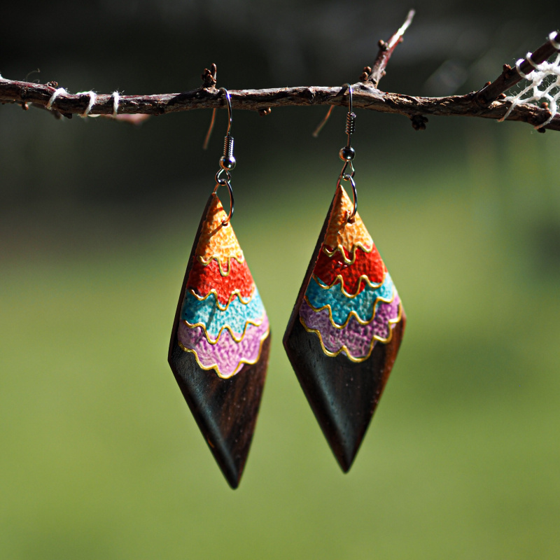 Dřevěné náušnice poutavého tvaru zdobené jasnými barvami zdůrazní vaši jedinečnost, originalitu a smysl pro detail. Jemná ruční práce snoubící se s přírodním materiálem a půvabným zdobením vás učiní nepřehlédnutelnou.
