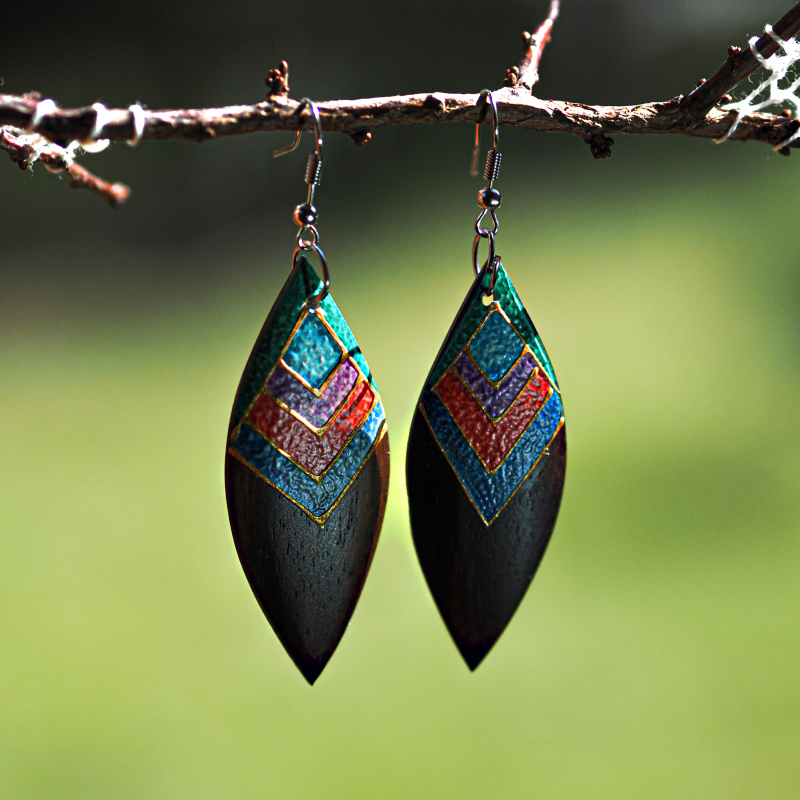 Dřevěné náušnice poutavého tvaru zdobené pestrými barvami zdůrazní vaši jedinečnost, originalitu a smysl pro detail. Jemná ruční práce snoubící se s přírodním materiálem a půvabným zdobením vás učiní nepřehlédnutelnou.