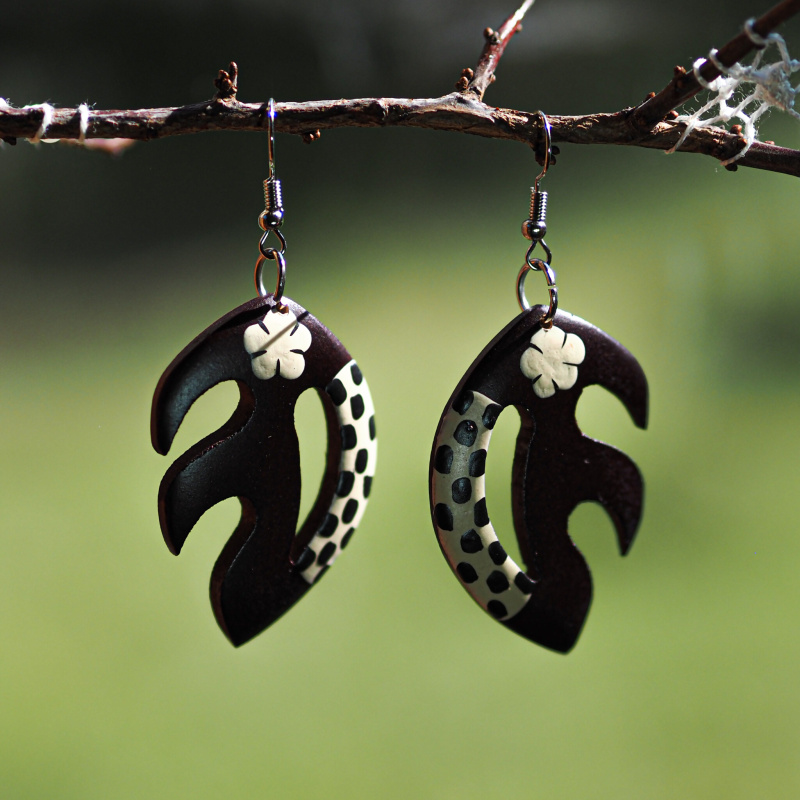 Dřevěné náušnice poutavého tvaru zdobené elegantními ornamenty zdůrazní vaši jedinečnost, originalitu a smysl pro detail. Jemná ruční práce snoubící se s přírodním materiálem a půvabným zdobením vás učiní nepřehlédnutelnou.