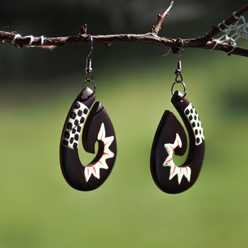 Dřevěné náušnice poutavého tvaru zdobené elegantními ornamenty zdůrazní vaši jedinečnost, originalitu a smysl pro detail. Jemná ruční práce snoubící se s přírodním materiálem a půvabným zdobením vás učiní nepřehlédnutelnou.