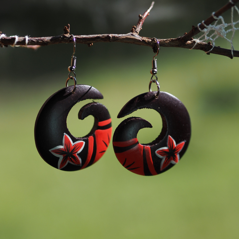 Dřevěné náušnice poutavého tvaru zdobené pestrými ornamenty zdůrazní vaši jedinečnost, originalitu a smysl pro detail. Jemná ruční práce snoubící se s přírodním materiálem a půvabným zdobením vás učiní nepřehlédnutelnou.