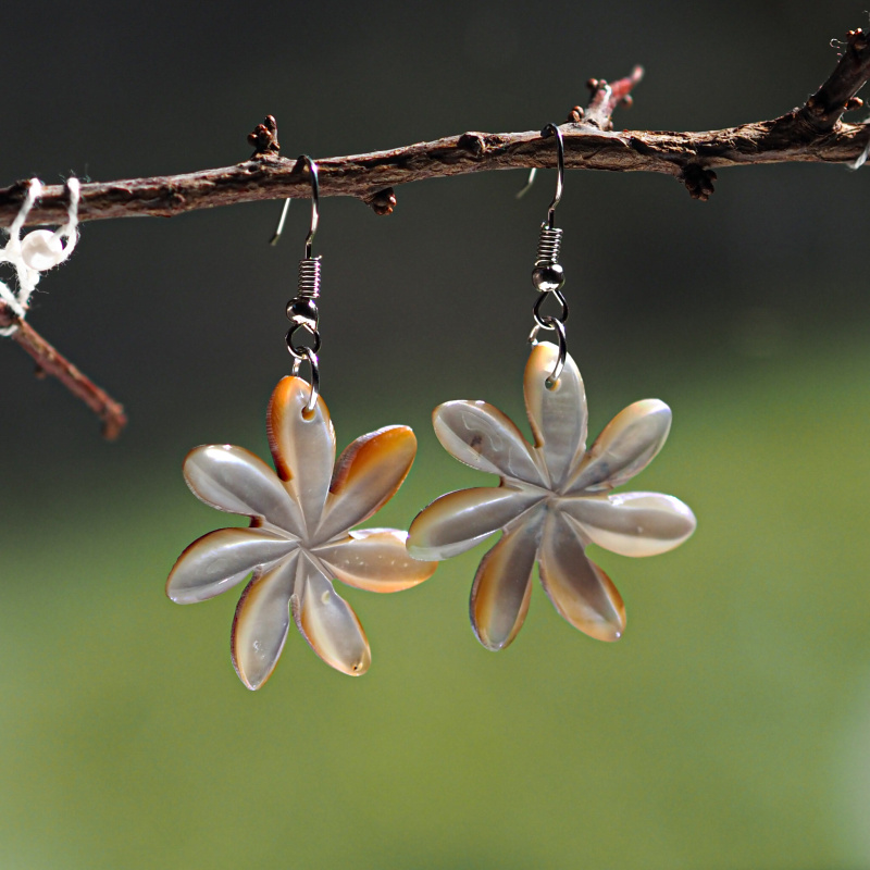 Perleťové náušnice poutavého tvaru květiny zdůrazní vaši jedinečnost, originalitu a smysl pro detail. Jemná ruční práce snoubící se s půvabem přírodního materiálu vás učiní nepřehlédnutelnou.