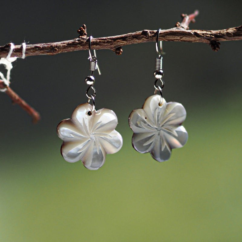 Perleťové náušnice poutavého tvaru něžné květiny zdůrazní vaši jedinečnost, originalitu a smysl pro detail. Jemná ruční práce snoubící se s půvabem přírodního materiálu vás učiní nepřehlédnutelnou.