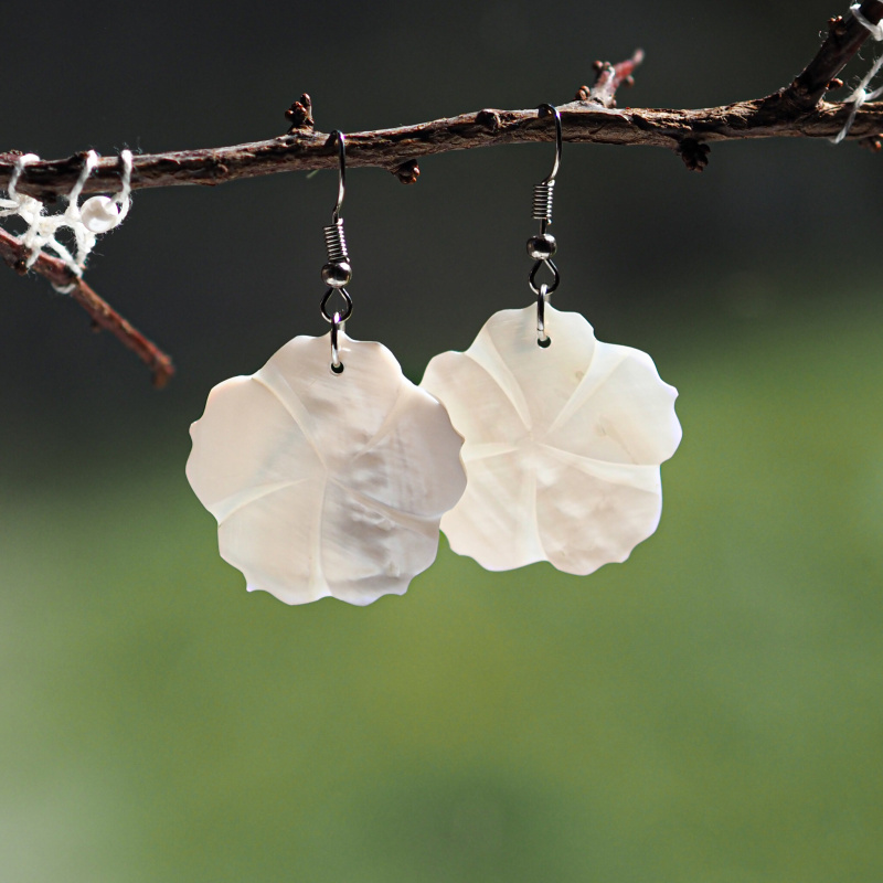 Perleťové náušnice poutavého tvaru něžné květiny zdůrazní vaši jedinečnost, originalitu a smysl pro detail. Jemná ruční práce snoubící se s půvabem přírodního materiálu vás učiní nepřehlédnutelnou.