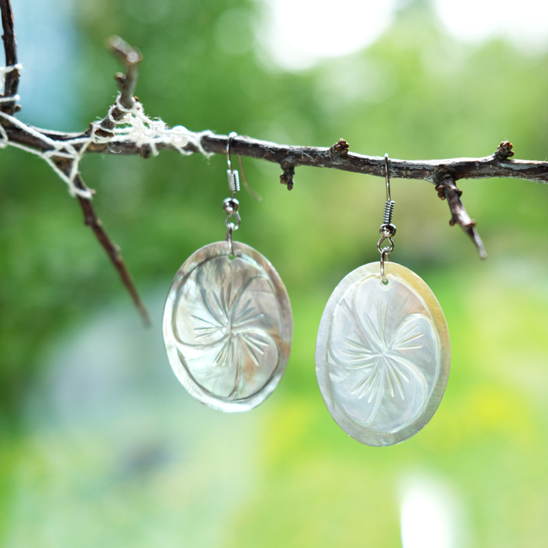 Perleťové náušnice oválného tvaru s něžným květinovým motivem podtrhnou vaši jedinečnost, originalitu a smysl pro detail. Jemná ruční práce snoubící se s půvabem přírodního materiálu vás učiní nepřehlédnutelnou.
