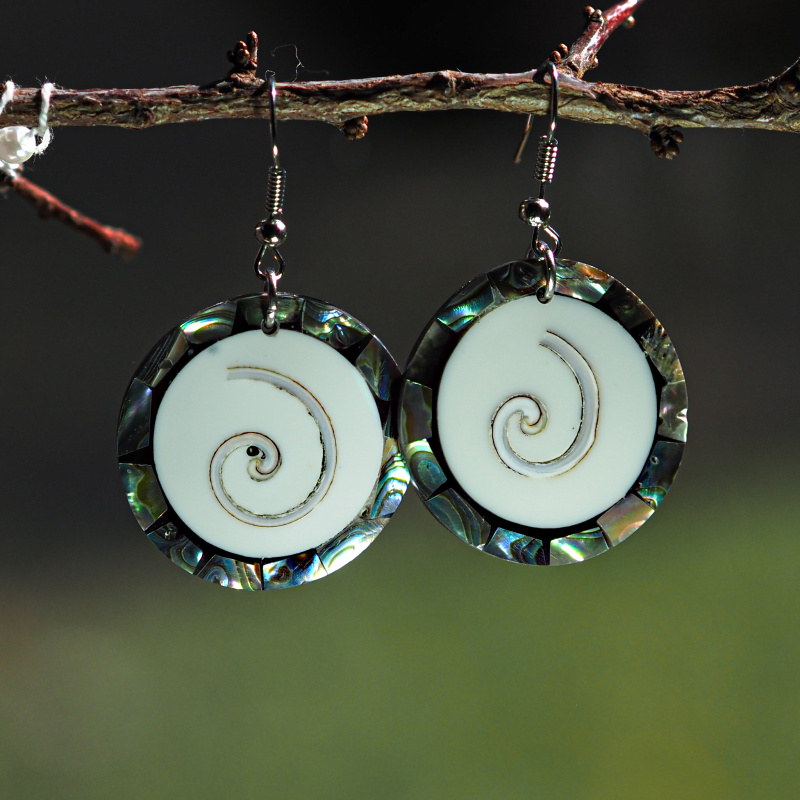 Perleťové náušnice kulatého tvaru s jemnou spirálou zdůrazní vaši jedinečnost, originalitu a smysl pro detail. Jemná ruční práce snoubící se s přírodním materiálem a půvabným zdobením vás učiní nepřehlédnutelnou.