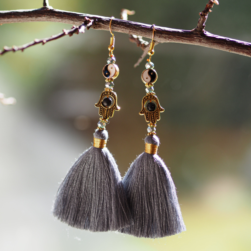 Boho úchvatné náušnice se symboly Jin Jangu a Hamsy zdobené bavlněným střapečkem zdůrazní vaši jedinečnost, originalitu a smysl pro detail. Střapec se při každém kroku volně pohupuje, dodávaje vám lehkost a nenucenou eleganci.