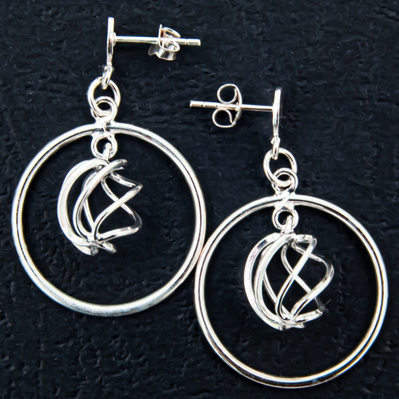 Elegantní pohyblivé stříbrné náušnice se spirálovitou kuličkou, zavěšenou uprostřed kruhu.