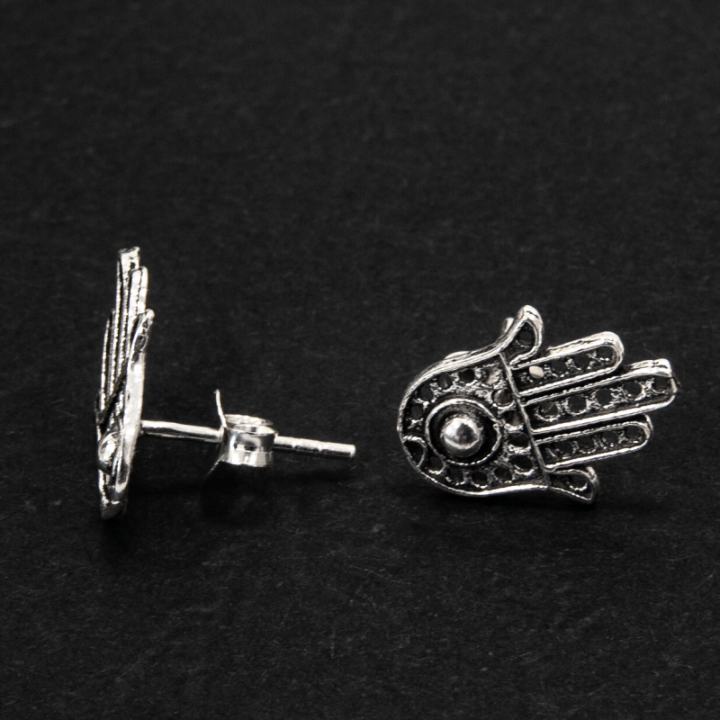Elegantní stříbrné náušnice ve tvaru Hamsovy ruky.