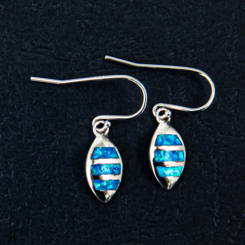 Elegantní stříbrné náušnice ve tvaru lístku se třemi proužky třpytivého modrého syntetického opálu.