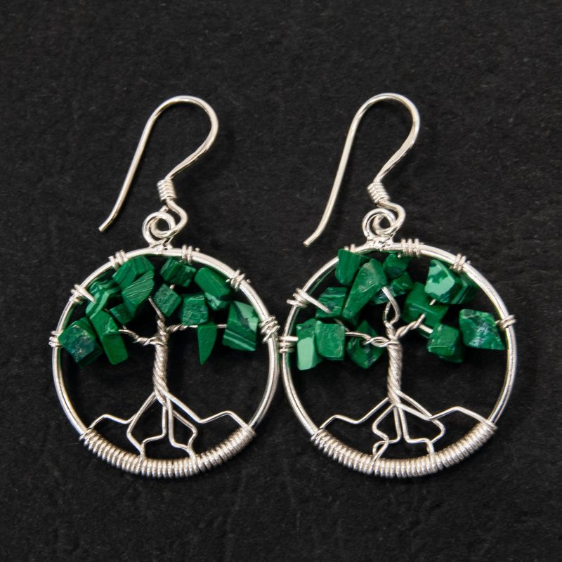 Jednoduché drátované náušnice ve tvaru stromu života z malachitu.
