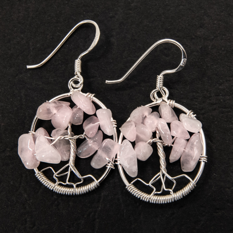 Jednoduché drátované náušnice ve tvaru stromu života z růženínu.