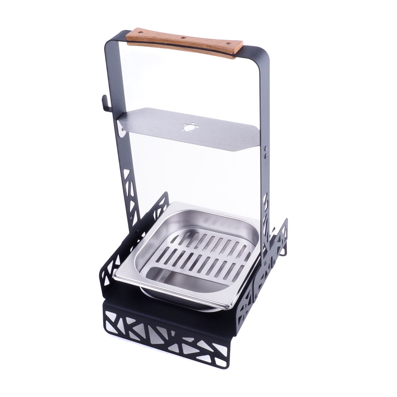 Praktický pomocník, sloužící k bezpečnému přenášení žhavých uhlíků a jejich rozpalování. Nerezová vanička i rošt jde ze stojanu vyndávat a dobře udržovat v čistotě.