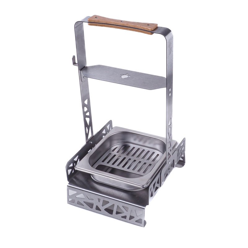 Praktický pomocník, sloužící k bezpečnému přenášení žhavých uhlíků a jejich rozpalování. Nerezová vanička i rošt jde ze stojanu vyndávat a dobře udržovat v čistotě.