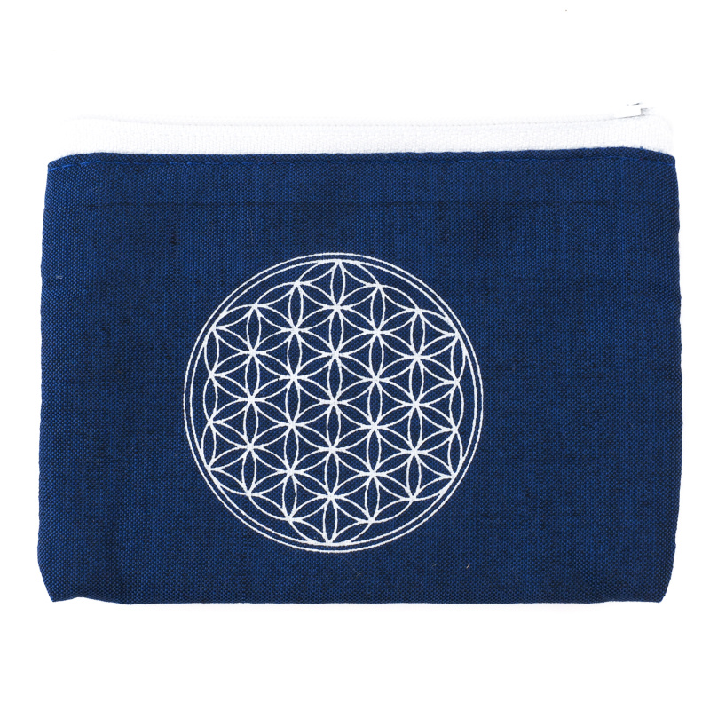 Kvalitní balijská peněženka je ušita z dvouvrstvé, na dotek velmi příjemné měkké bavlny v uklidňující, sametové modré (indigo) barvě a uzavíratelná na klasický zip. Vnitřní prostor není členěn, lze do ní uložit ledacos – od mincí a bankovek, přes doklady či vizitky, až po osobní talismany a jiné drobnosti denní potřeby. Peněženka je zdobena půvabným motivem Květu života.