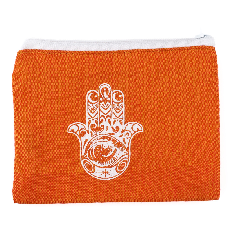 Kvalitní balijská peněženka je ušita z dvouvrstvé, na dotek velmi příjemné měkké bavlny v energické, povzbuzující oranžové barvě a uzavíratelná na klasický zip. Vnitřní prostor není členěn, lze do ní uložit ledacos – od mincí a bankovek, přes doklady či vizitky, až po osobní talismany a jiné drobnosti denní potřeby. Peněženka je zdobena symbolem Hamsy.